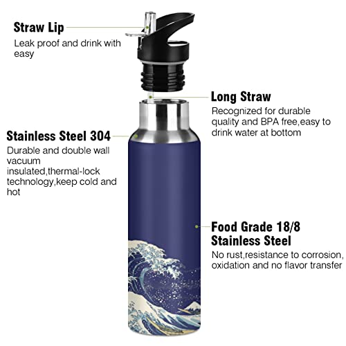 Mnsruu Onda di Surf Giapponese Kanagawa Borraccia Termica con Cannuccia Sportiva, Bottiglia Acqua in Acciaio Inox Isolato 600ML Senza BPA per Bevande Calde e Fredde per Bambini Scuola
