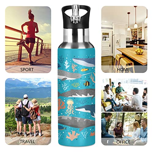 Mnsruu Pesce Squalo Balena Blu Mare Borraccia Termica con Cannuccia Sportiva, Bottiglia Acqua in Acciaio Inox Isolato 600ML Senza BPA per Bevande Calde e Fredde per Bambini Scuola