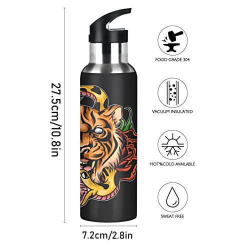 Mnsruu Tigre Rosa Serpente Tatuaggio Borraccia Termica con Cannuccia Sportiva, Bottiglia Acqua in Acciaio Inox Isolato 600ML Senza BPA per Bevande Calde e Fredde per Bambini Scuola