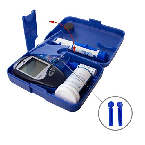 KIT COMPLETO: glucometro digitale (con batteria), strisce reattive, ago, lancetta sterile e custodia inclusa