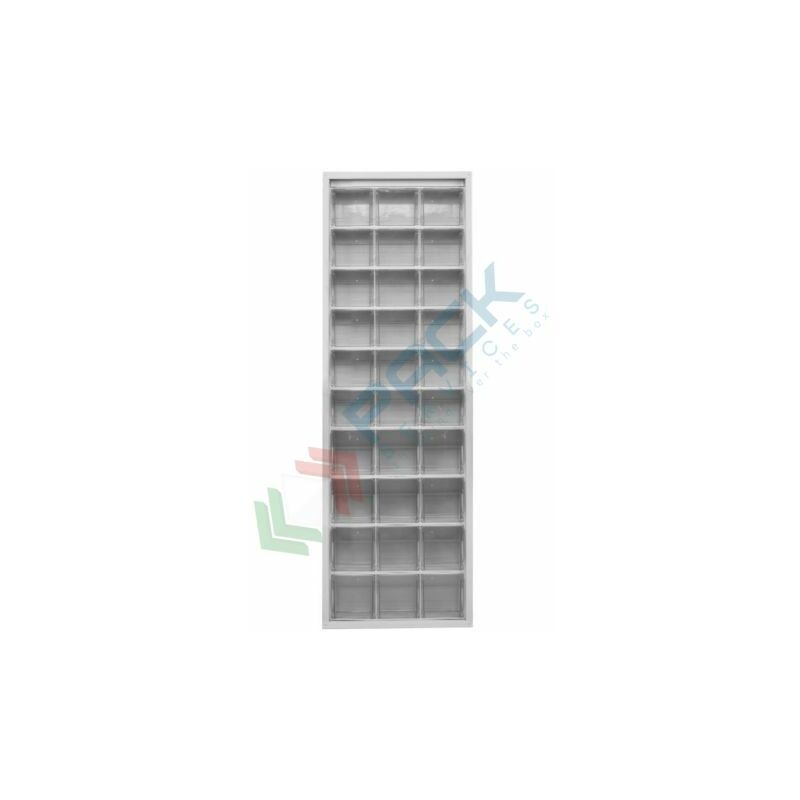 SCAFFALE PORTAMINUTERIA CON 30 CASSETTI Scaffalatura in lamiera elettrosaldata, verniciato in polvere epossidica, con 30 cassetti, Mis. 665 L x 250 P x 2000 H mm. Scaffale composto da 4 cassettiere Cod. Art. CRBOX-4G + 6 cassettiere Cod. Art. CRBOX-3G. Scaffale con cassettiere porta minuteria fornito già montato. Colore struttura grigio chiaro RAL 7035, cassettiere colore grigio chiaro simile RAL 7035. Caratteristiche tecniche: Misura: 665 L x 250 P x 2000 H mm Colore struttura: Grigio chiaro RAL 7035 Colore cassette: Grigio chiaro RAL 7035 Capacità di carico: 170 Kg Capacità Lt: 64,2 Lt Temperatura di esercizio: - 50° + 150° C Lo scaffale è allestito con: 4 cassettiere 600 L x 200 P x 215 H mm, con 3 cassetti, colore grigio chiaro - Capacità singolo cassetto 2,5 Lt / 13 Kg (Cod. Art. CRBOX-4G) 6 cassettiere 600 L x 155 P x 175 H mm, con 3 cassetti, colore grigio chiaro- Capacità singolo cassetto 1,9 Lt / 13 Kg (Cod. Art. CRBOX-3G) Per un totale di 30 cassetti