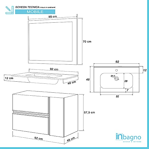 Mobile bagno sospeso moderno da 90 e 110 cm completo di lavabo in ceramica e specchio su pannello della stessa finitura del mobile