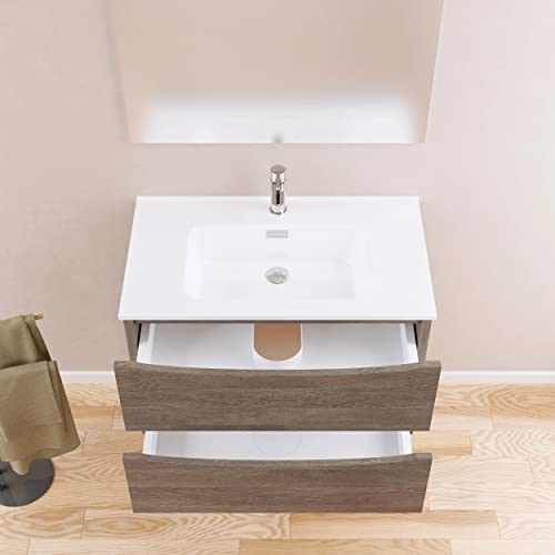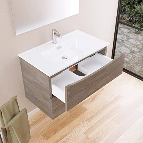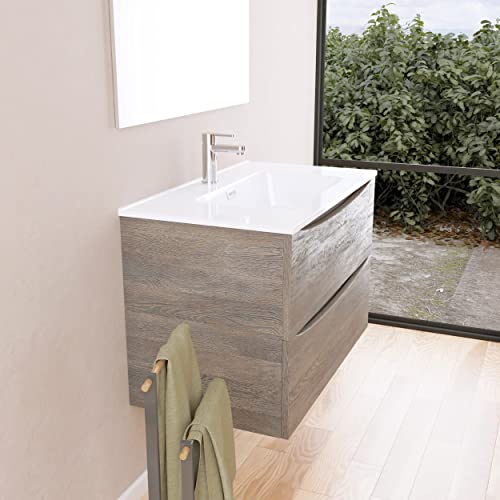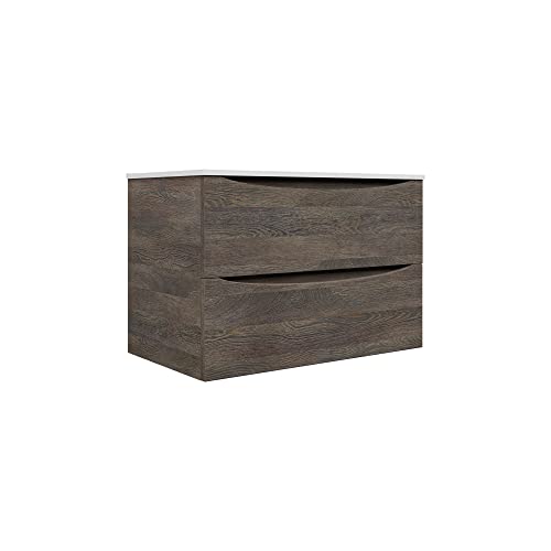 Mobile Bagno Sospeso Mod. Aspen 90cm Colore Rovere Scuro con 2 Cassetti Soft-Close (Chiusura Rallentata) in Legno Mdf con Lavabo Integrato e Specchio Filo Lucido Incluso