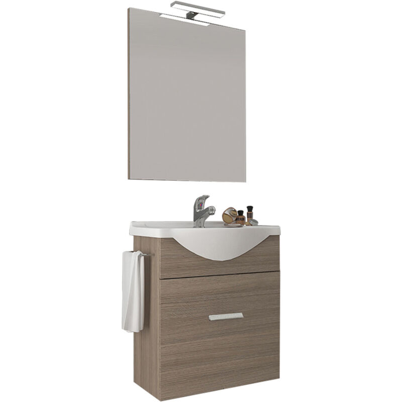 Valida alternativa d'arredo per bagni a dimensioni ridotte. Composto da base in legno rovere fumo ad anta doppia con maniglie, lavabo in ceramica, specchiera panoramica con illuminazione superiore led. Dimensioni espresse (larghezza x profondità x altezza).