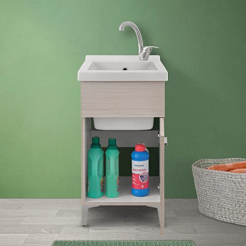Mobile lavatoio Lavanderia 45x50 cm in Legno con Vasca in Ceramica, Montato, Completo di Kit sifone e piletta (Larice)