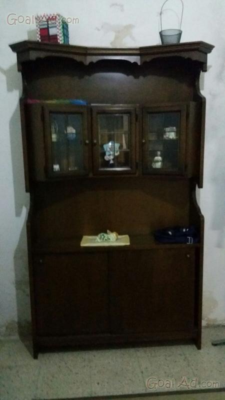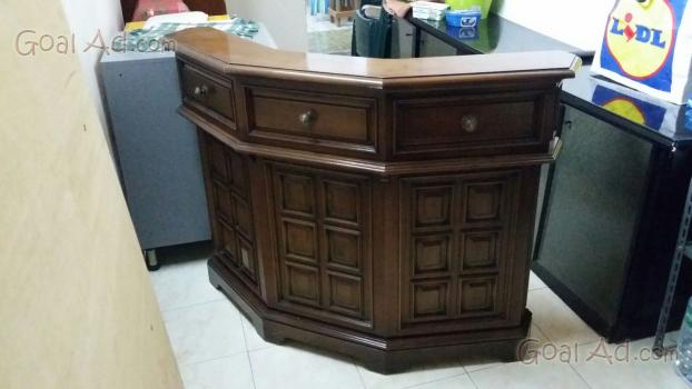 Mobile bar in legno in due pezzi, tre vetrinette nella parte superiore e sportelli inferiori in entrambe le parti del mobile.