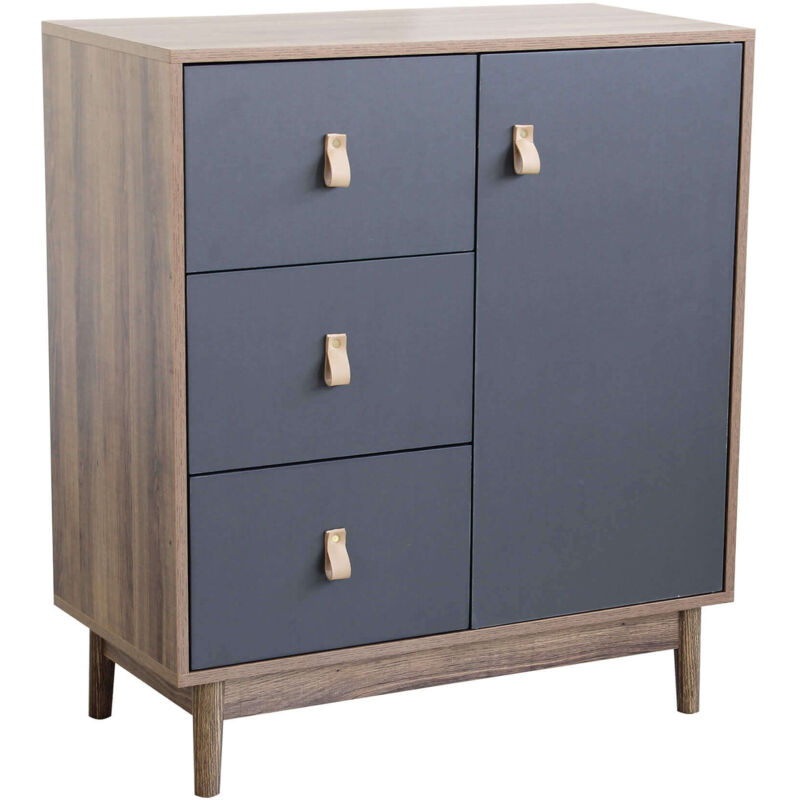 Il mobiletto Joris con anta e 3 cassetti dal design semplice è adatto per chi ama uno stile classico dalle linee essenziali. Realizzato interamente con struttura in legno ha una struttura stabile. solida e resistente. Il mobile è caratterizzato da 2 comodi ripiani chiusi. 1 anta con maniglie e 3 cassettini dove poter riporre oggetti e minuterie. Mobiletto Joris Con anta. 2 ripiani e 3 cassetti Dimensioni: 80 x 38 x h90 cm Colore: legno Con anta in mdf nero
