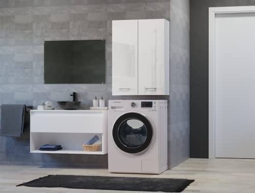 Mobili per la lavatrice con due armadi, due ripiani e una lavatrice Bagnoli, D: H: 90 cm, L: 64 cm, P: 30 cm, colonna del bagno, scaffale per il bagno, mobile lavatrice, Bianco/bianco lucido