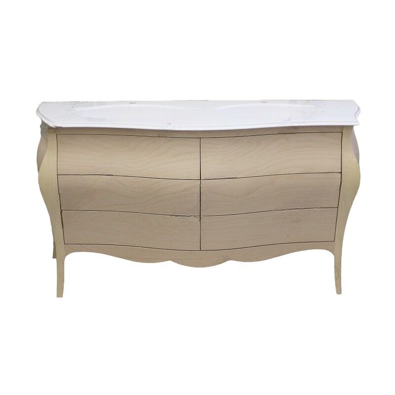 MOBILI 2G - Mobile bagno 6 cassetti bombato con doppio lavello legno grezzo 162x58x83 Quantità: 1 mobile bagno con lavello Mobile bagno bombato a 6 cassetti. Guide dei cassetti in metallo con ruote in plastica. Misure: Larghezza Cm. 162 Profondità Cm. 58 Altezza Cm. 83 Materiali: Gambe: legno massello. Fianchi e facciate dei cassetti: pannello in multistrati impiallacciato. Schienale e fondi dei cassetti: compensato. Guide dei cassetti in metallo con rotelle. Piano in mineral marmo con vasche per bagno bombato. Doppio lavello Con fori centrali per miscelatore. Misure: Larghezza Cm. 160 Profondità Cm. 58 Altezza Cm. 2 Materiali: fusione di resina e polvere di marmo. Finitura: colore bianco. Il Mineralmarmo è un materiale pratico e durevole, alla vista è completamente bianco. Il mobile arriva montato Finitura: grezzo non verniciato Il mobile è pronto per essere verniciato Il mobile non è finito Mobili grezzi artigianali, pronti per essere verniciati, laccati o decorati I mobili grezzi