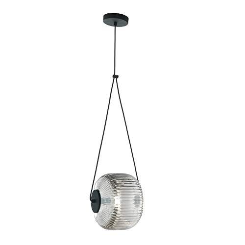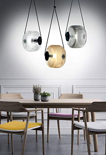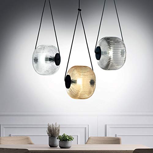 Sospensione in vetro soffiato millerighi. Struttura in metallo verniciato. Cavetti regolabili in lunghezza. Disponibile in diversi colori.
