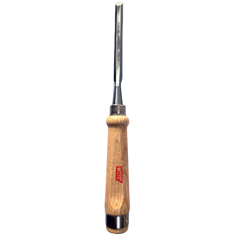 Scalpello modello 10. larghezza: 10 mm. wuto. trapano a mano per fare fori senza causare crepe nel legno. con manico in legno e taglio cavo. presentato su una gruccia.