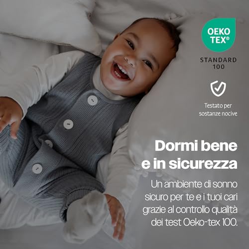 Certificato OEKO-TEX STANDARD 100: Abbiamo scelto materiali che soddisfano rigorosi standard di sicurezza e qualità. Il nostro coprimaterasso è certificato OEKO-TEX STANDARD 100, il che significa che è privo di sostanze chimiche nocive, offrendoti una tranquillità