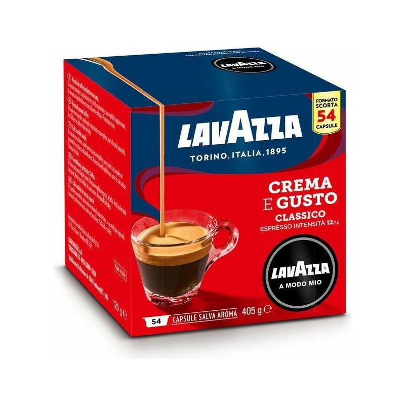 Lavazza Crema e Gusto 54 pz Capsule originali caffè per macchine da caffe a Modo Mio. Tipo di prodotto: Capsule caffè, Tipologie di bevande: Espresso, Livello di tostatura del caffè: Tostatura media. Peso: 405 g. Quantità per pacco: 54 pz