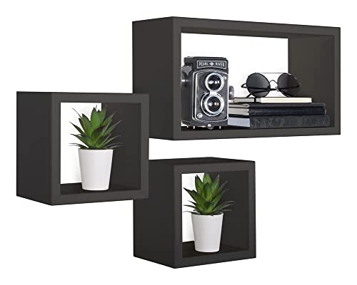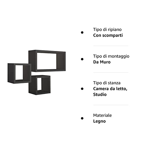 MODULARREDO | TRIBU Set di 3 Mensole da Muro, Cubi Arredo, Mensole Cubo, Cubi Parete, Cubi Portaoggetti, 44x24 p15.5 cm, 20x20 p15.5 cm e 20x20 p15.5 cm, Nero, Kit Tasselli Incluso - Made in Italy