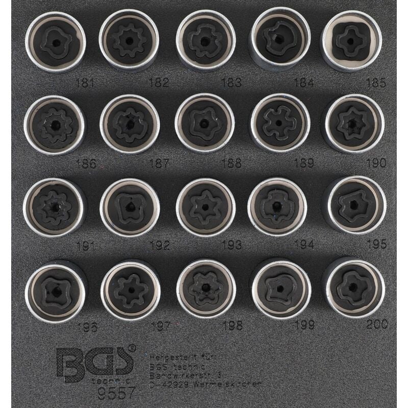 Per montare e smontare bulloni antifurto per cerchi Opel (tipo B) Nel modulo per carrello Oggetto della fornitura: 20 inserti per bulloni antifurto per cerchi nelle misure: #181 - #182 - #183 - #184 - #185 - #186 - #187 - #188 - #189 - #190 - #191 - #192 - #193 - #194 - #195 - #196 - #197 - #198 - #199 - #200