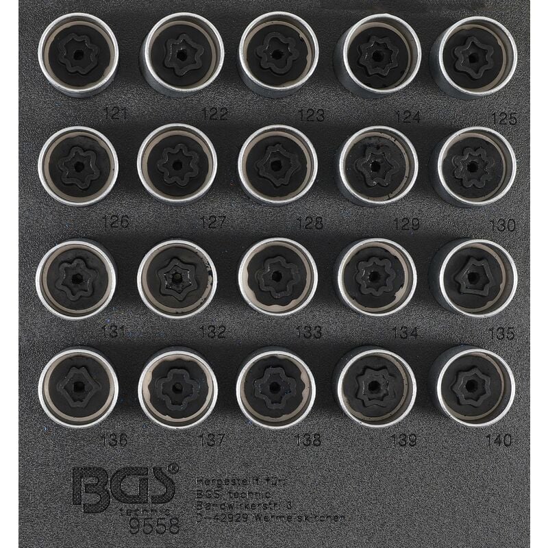 Per montare e smontare bulloni antifurto per cerchi Opel (tipo C) Nel modulo per carrello Oggetto della fornitura: 20 inserti per bulloni antifurto per cerchi nelle misure: #121 - #122 - #123 - #124 - #125 - #126 - #127 - #128 - #129 - #130 - #131 - #132 - #133 - #134 - #135 - #136 - #137 - #138 - #139 - #140