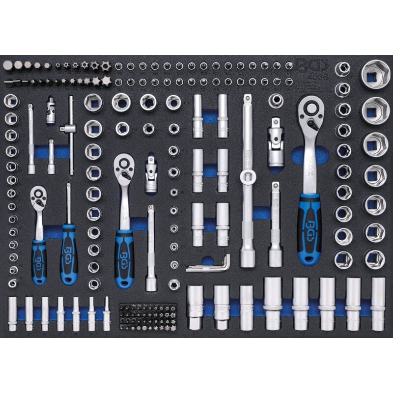 Inserti per bussole in versione esagono Pro Torque® Cricchetto reversibile a dentatura fine (72 denti) Altezza dell'inserto senza attrezzi: 32 mm Oggetto della fornitura: Con azionamento da 6,3 mm (1/4): Cricchetto reversibile, impugnatura scorrevole, impugnatura portabussole 150 mm Prolunghe 50 e 100 mm, snodo con molla 13 inserti per chiavi a tubo: 4 - 4,5 - 5 - 5,5 - 6 - 7 - 8 - 9 - 10 - 11 - 12 - 13 - 14 mm 7 inserti per chiavi a tubo, profondi: 4 - 5 - 6 - 7 - 8 - 9 - 10 mm 5 inserti per chiavi a tubo, profilo a E: E4 - E5 - E6 - E7 - E8 1 portainserti per punte da 6,3 mm (1/4) 3 portainserti con intaglio a croce PH: PH0 - PH1 - PH2 3 portainserti con intaglio a croce PZ: PZ0 - PZ1 - PZ2 4 portainserti, intaglio piatto: 4 - 5,5 - 6,5 - 7 mm 4 portainserti esagono interno: 3 - 4 - 5 - 6 mm 8 portainserti profilo a T (per Torx): T8 - T9 - T10 - T15 - T20 - T25 - T27 - T30 8 portainserti profilo a T (per Torx) con foro: T8 - T9 - T10 - T15 - T20 - T25 - T27 - T3 Con azionamento da