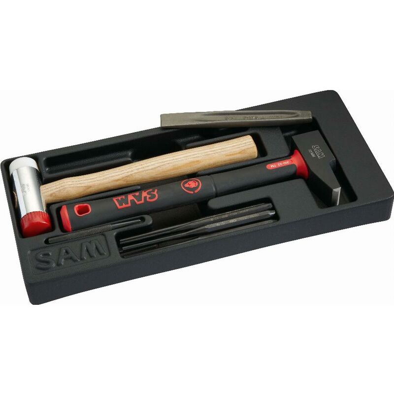 Dettagli: Vassoio in ABS. Dettaglio:- X1 martello SAMSOPLUS® 310-32TM,- X1 mazza 320-32D,- X1 scalpello 8N-3A,- X1 scalpello a profilo costante 3-175A,- X5 martelli a spillo 7-25A, 7-35A, 7-50A, 7-70A e 7-90A Peso: 1,8 kg Caratteristiche: Contenitore: Modulo ABS Numero di pezzi: 9