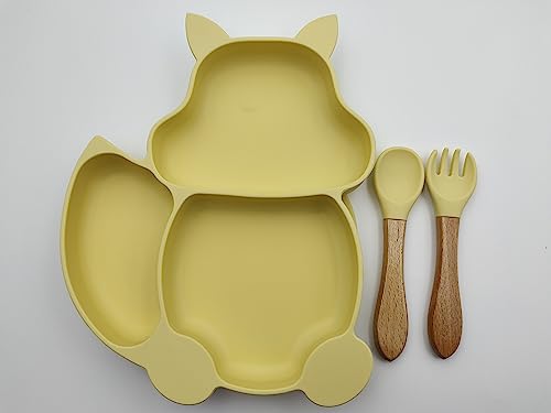 Mohito Piatto per Bambini in Silicone con Cucchiaio e Forchetta,Tovaglietta Antiscivolo in Silicone con Aspirazione Si Adatta Maggior parte Vassoi per Seggiolone (Scoiattolo-Giallo)