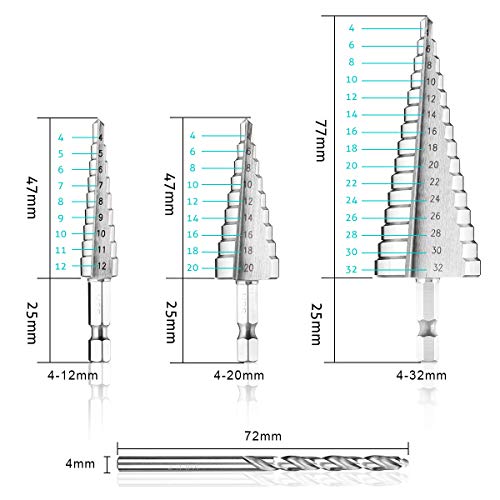 【Dimensioni】: 4-12mm / 4-20mm / 4-32mm. Dimensioni diverse, controllo libero sulla dimensione del foro. Punta trapano elicoidale 4mm