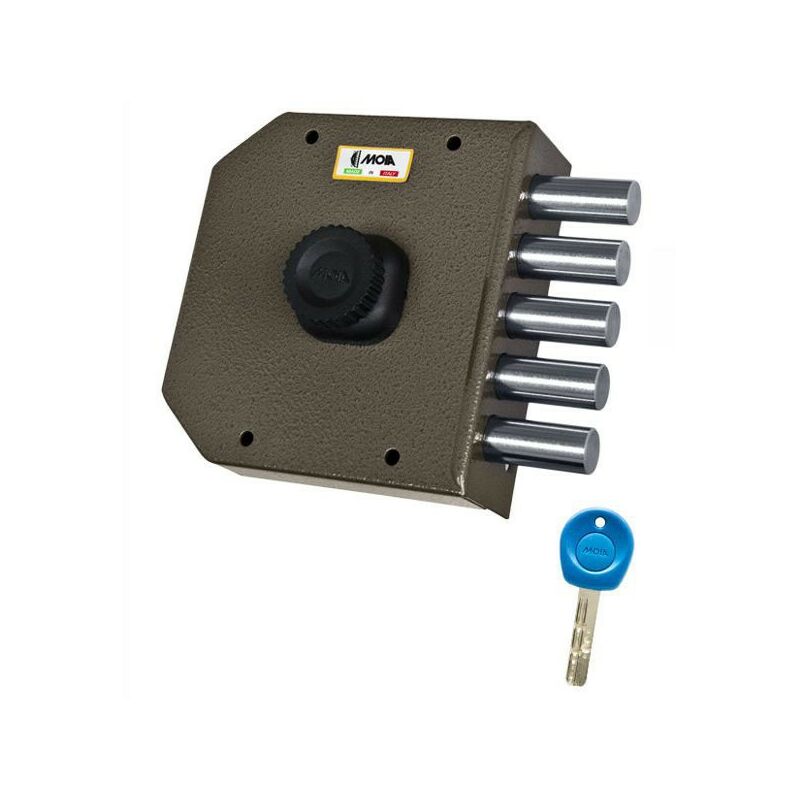 Serratura pompa chiave punzonata applicare legno Chiusura laterale - Pomolo interno Catenacci laterali 5 pistoni Interasse catenacci mm 26 Scatola mm 143,5x153,5x29 - Entrata mm 63 Dimensioni cilindro mm 30x59 3 chiavi + chiave cantiere