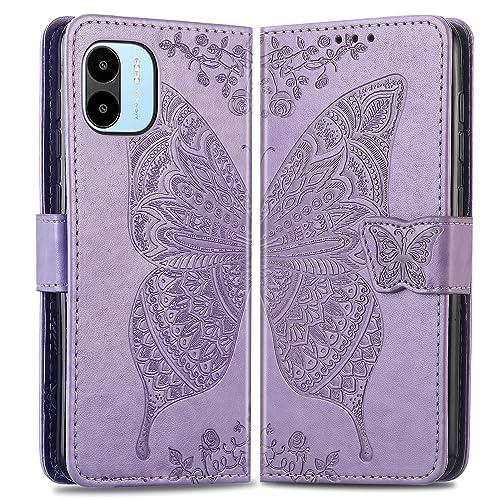 MOJIA Custodia per Xiaomi Redmi A1 / Redmi A2, Farfalla in Portafoglio Flip Cover Sottile con Chiusura Magnetica Slot per Schede Cavalletto Cinturino da Polso. Lavender