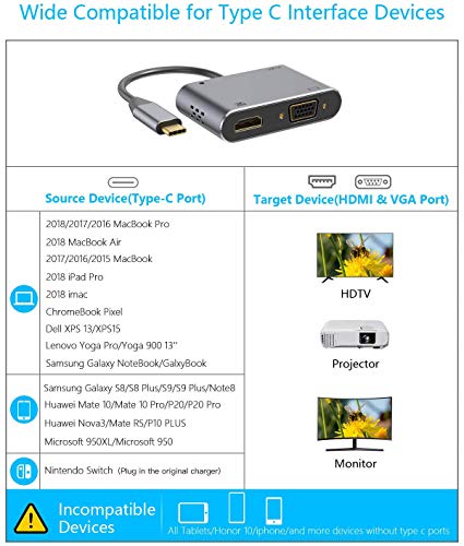 [Ampia Compatibilità]: Modelli di supporto adattatore da USB C a HDMI VGA: Nintendo Switch, 2018 iPad Pro, 2015/16/17/18 MacBook 12 "/ 13" / 15 ", 2016/17 / 18MacBook Pro, Dell XPS12 (9250) / Dell XPS13 (9350) / Dell XPS15 (9550) / HP Spectre X2 / HP Spectre X360/ HP Elite X2 1012 G1 / Acer Switch Alpha 1 / Acer Spin7 / Acer Chromebook R13 / Google Chromebook Pixel / Lenovo 900 / Lenovo 910 / Samsung s8 s8plus / Samsung S9 S9plus / Huawei MateBook / Mate 10 / Mate 20 / P20 / P30 Pro