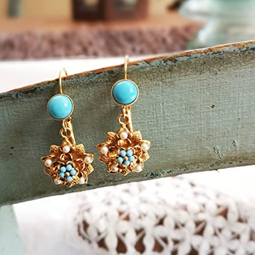 Mokilu' - Gioielli - Orecchini Vintage - Donna - Ottone dorato 24kt - Motivo floreale - Pietra turchese - Cabochon - Perle