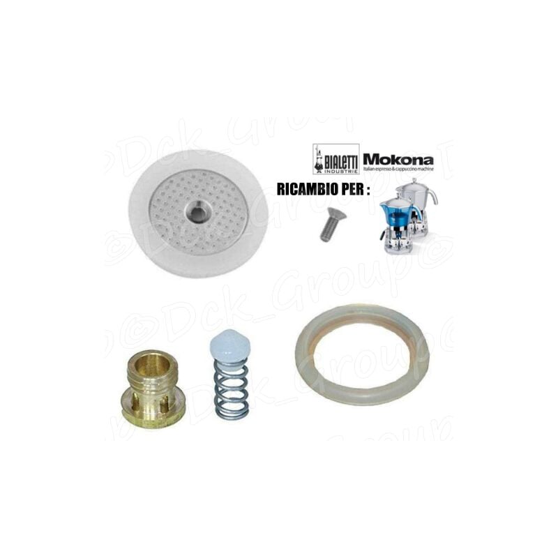 KIT MANUTENZIONE PER MACCHINA CAFFE' MOKONA BIALETTI VALVOLA GUARNIZIONI FILTRO Il kit comprende: - 1 x Valvola e con molla e gommino - 1 x Guarnizione grande sottocoppa - 1 x Filtro piccolo con vite e guarnizione piccola