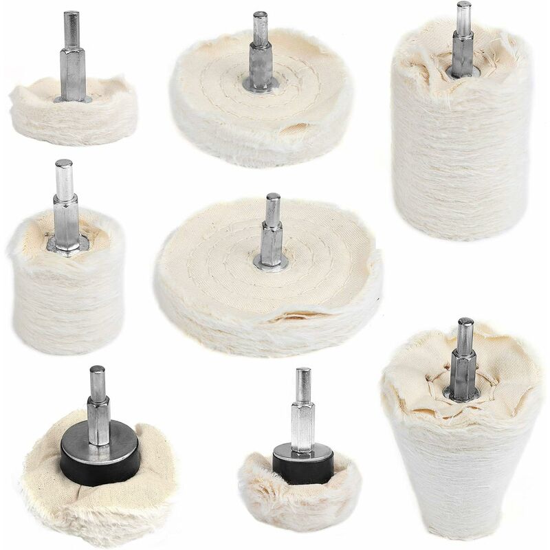 I tamponi per lucidatura sono realizzati in cotone di buona qualità, con diversi strati di tessuto cuciti insieme nel mezzo. Sono morbidi e tengono bene insieme e faranno brillare i tuoi oggetti preferiti senza alcun danno. Adatto per levigatura e lucidatura della superficie di metallo, gioielli, acciaio inossidabile, alluminio, legno, plastica, ceramica, vetro, orologi e qualsiasi oggetto cromato o verniciato. Le mole lucidanti si adattano a tutti i tipi di smerigliatrici elettriche, trapani elettrici o altri utensili rotanti. I gambi tondi da 1/4 sono di forma esagonale in modo che non si allentino durante la lucidatura. Utilizzare con a il trapano a velocità variabile può prevenire una rotazione troppo rapida del pad e uno strappo prematuro. Lavorare con un composto lucidante come la cera avrà un effetto lucidante migliore. I tamponi per lucidatura sono appositamente progettati per lucidare aree incassate come cerchi, ruote di motociclette, collettori, ossidazioni
