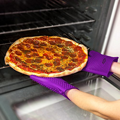 Estremamente riscaldare guanto resistente a dare la massima protezione. La protezione contro il calore superiore a temperature tiene in modo sicuro fino a 425 gradi Fahrenheit. Barbecue guanti in silicone puro per cucinare, cuocere, guanti da forno, il campeggio, stripping e altro ancora.