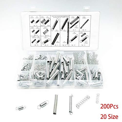Molla Assortimento, Molla a compressione Kit Assortimento,Molla di trazione e compressione in acciaio al carbonio Set Assortimento Molle con scatola, 20 dimensioni(200 pezzi/set)