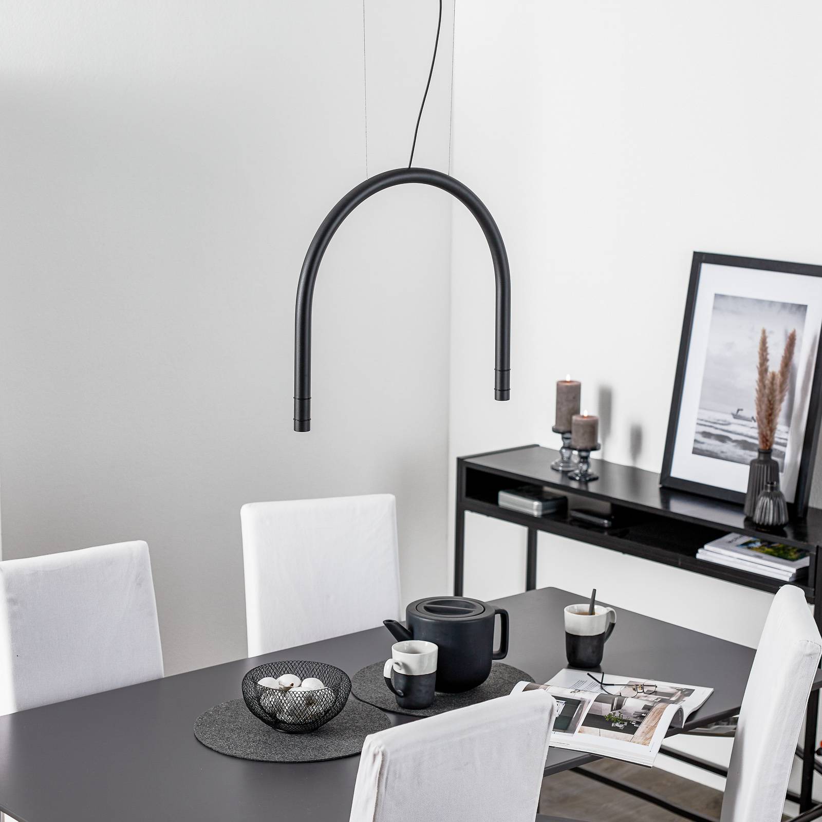 Luce a sospensione curva a LED Arkade Single Come una "U" rovesciata, l'apparecchio a sospensione Arkade LED pende dal soffitto ed emette una luce puntuale nella stanza attraverso le sue due estremità. È dotato di LED bianchi caldi installati in modo permanente, che sono caratterizzati da un'alta resa cromatica, in modo che tutti i colori appaiano molto fedeli alla natura. Il paralume a forma di arco è fatto di alluminio robusto e il colore nero opaco è perfetto per aggiungere un accento alla moda. La lampada a sospensione a LED può anche essere regolata in luminosità tramite un dimmer esterno (Dali - non incluso). Sia nel soggiorno e nella sala da pranzo di casa, sia sopra un bar o la reception di un hotel - Arkade ha capito tutto!