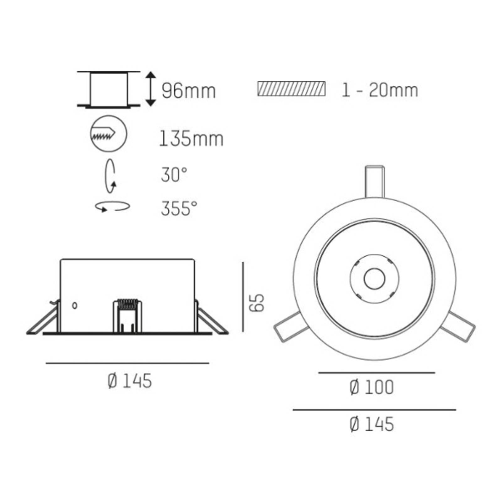 Spot LED da incasso a soffitto Vibo R con luce bianca universale L'aspetto esterno del faretto da incasso a soffitto Vibo R LED, con la sua forma rotonda e l'alloggiamento in alluminio di alta qualità, è progettato con sobria eleganza. È dotato di innovativi LED che emettono la luce direttamente verso il basso. Il faretto da incasso è ideale per illuminare gli uffici o l'home office perché la luce bianca universale favorisce e supporta la concentrazione del lavoro. Inoltre, il faretto LED può essere utilizzato bene anche per l'illuminazione dei corridoi - sia come fonte di luce a casa o in un hotel chic. Questo perché il faretto da incasso può essere utilizzato sia in aree private che pubbliche, come una fonte di luce elegante in ingressi, foyer o corridoi in hotel e sale espositive in gallerie e musei. - L'attrezzatura di controllo non è inclusa - può essere ordinata tramite gli accessori - Angolo del fascio: 35 - Gamma girevole: 30 - Gamma di rotazione: 355° - Spessore del soffitto: max. 2,0 cm - Valore di abbagliamento (UGR)