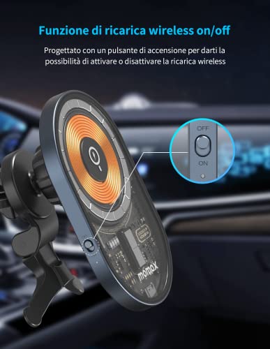 MOMAX Caricatore magnetico per auto di ricarica wireless, trasparente Mag-Safe compatibile con presa d'aria di ricarica, compatibile con iPhone 15/15 Plus/15 Pro/15 Pro Max/14/14 Pro/14 Pro Max Series