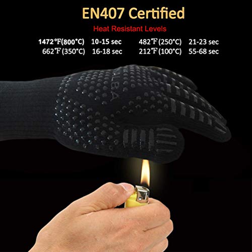 Guanti da barbecue ad alta temperatura in fibra aramidica di alta qualità [800°C] - Guanti protettivi certificati EN407/EN420 contro i rischi termici. Con tessuto di aggiornamento, il guanto può resistere a 800 °C per 10-15 secondi, più sicuro di altri tessuti allentati a buon mercato. Fornire la massima protezione per voi quando si tratta di pentole calde e carbone e legna per cottura durante la cottura, la griglia, la cucina, ecc.