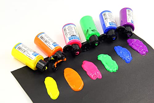 Colori a base acrilica: questi colori vivaci sono atossici e possono essere utilizzati da giovani e anziani. I colori sono parzialmente coprenti sui tessuti chiari e rimangono sul tessuto dopo il fissaggio anche in lavatrice. I pigmenti al neon non si illuminano al buio e non svolgono la loro funzione solo in condizioni di luce naturale o UV e in ambienti discreti utilizzando la luce ultravioletta.