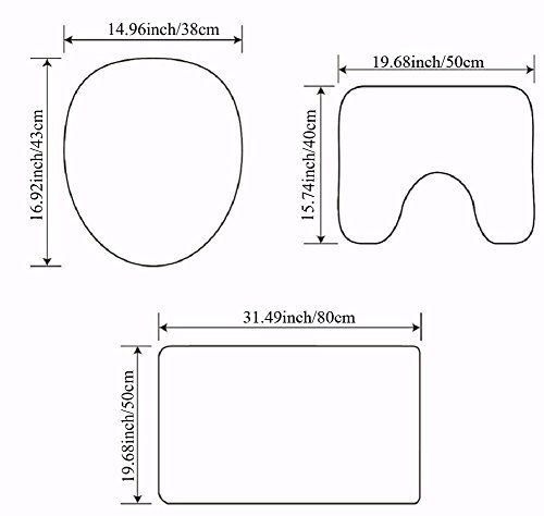 Questo set da 3 pezzi è composto da 1 tappeto rettangolare 80x50cm + 1 tappeto a forma di U 50x40cm + 1 tappeto coperchio del water toilet 38x43cm