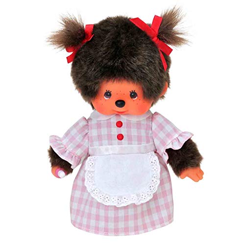 Graziosa ragazza Monchhichi con vestito a quadretti per coccolarsi, giocare e amare, dimensioni circa 20 cm