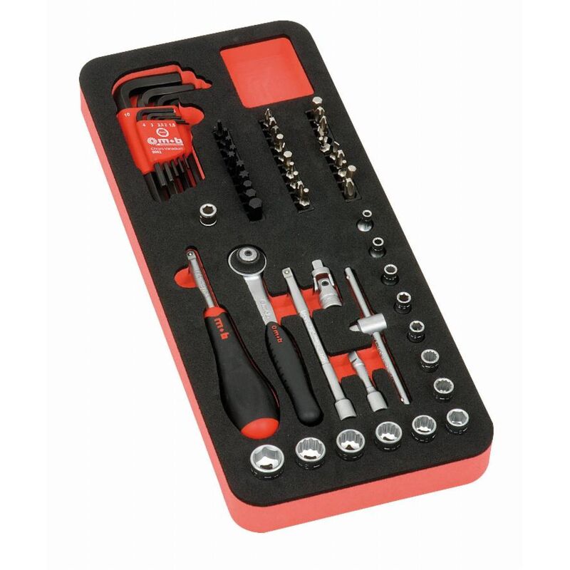 Dettagli: 13 bussole esagonali: 3,2-4-5-5,5-6-7-8-9-1-11-12-13-14 mm / 1 impugnatura scorrevole 115 mm / 1 cricchetto / 1 cardano / 2 prolunghe 5 e 125 / 1 valigetta di 9 chiavi maschio / 3 punte di cacciavite su cremagliera / 1 impugnatura a pressione / 1 presa portabit. In un modulo di schiuma bicolore da 385 x 165 mm. Ogni utensile ha il suo posto. Gli utensili mancanti possono essere trovati in pochi secondi grazie allo sfondo rosso. La schiuma bicolore ad alta densità non si rompe, non trattiene l'umidità ed è resistente ai prodotti da officina. Specifiche: Contenuto: 59 pezzi