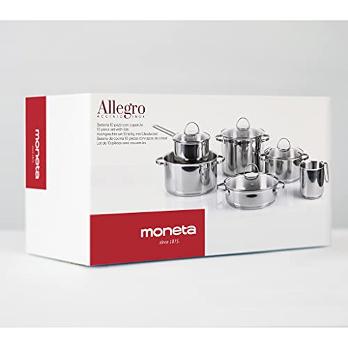Moneta Allegro Batteria 10 pezzi in acciaio Inox, composta da: Pentola 22cm, casseruola 2 manici 20 cm, casseruola 2 manici 24 cm, Tegame 24 cm, casseruola 1 manico 16 cm, bollilatte 12 cm, coperchi 16-20-22-24 cm