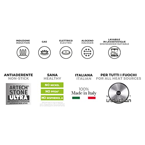 Rivestimento Artech Stone Ultra effetto pietra dalla superficie ruvida per chi desidera una pentola che non teme le materie forti. Ideale per cotture veloci, uniformi e senza grassi. Estremamente resistente ai graffi e alle abrasioni. Senza BPA, PFOA e Nickel.