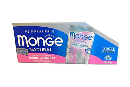 Monge Natural Supremium quality Cibo umido per Gatti adulti gusto Tonno con Gamberetti cotti al vapore. Confezione da 24 bustine (1 bustina = 80 gr.) Senza coloranti e conservanti