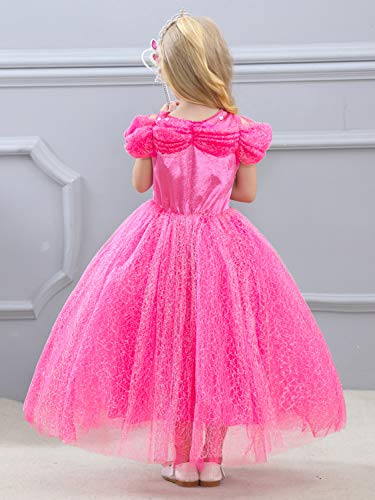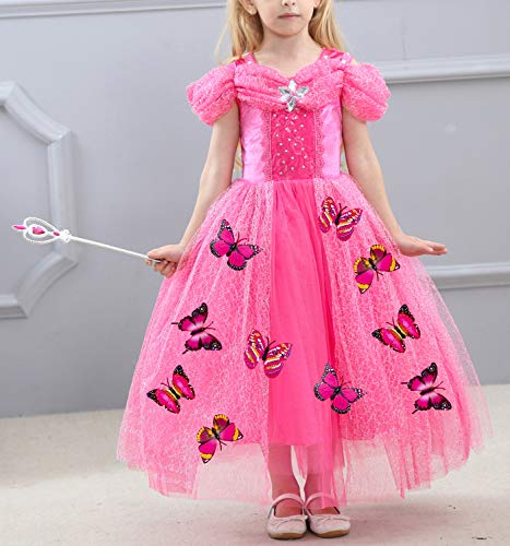 Monissy Costume Frozen Principessa Elsa Abito Blu Pizzo Manica Lunga Tulle Lucido Farfalla Tiara Parrucca Guanto Bacchetta Magica Costume Halloween Compleanno, Rosa senza maniche, 120