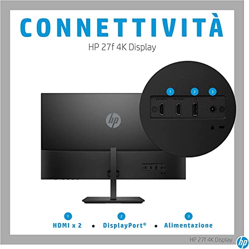 HP - PC 27f Monitor 4K, Schermo IPS UHD 27”, AMD FreeSync, Tempo Risposta 5ms, Overdrive, Risoluzione 3840 x 2160, Micro-Edge, Antiriflesso, DiplayPort, HDMI, Altezza/Inclinazione Regolabili, Nero