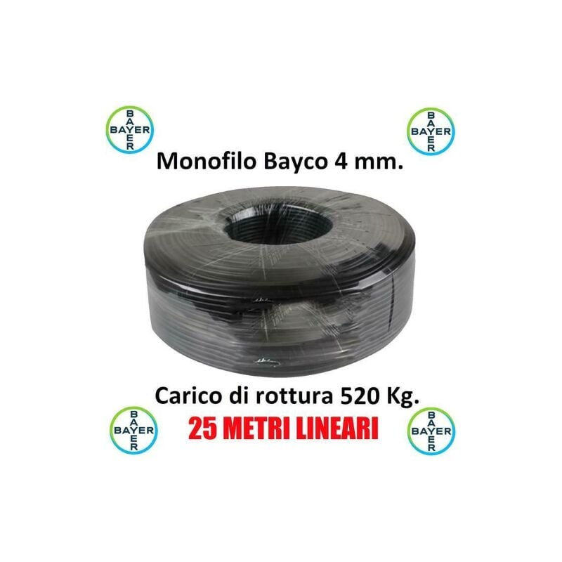 Monofilo 25 metri Bayco da 4 mm adatto per tirantare antenne, tralicci, ecc. Idoneo per tirantare pali e tralicci di piccole, medie dimensioni. - Non si allunga dopo il primo tensionamento (+4-5%) - Indistruttibile - Durata eterna - Non si deteriora nel tempo - Nessuna ossidazione - Non conduce calore ed elettricita' - Carico di rottura 520 KG VENDITA RIFERITA A 25 METRI LINEARI DI FILO - NO PRETAGLIATO! - ATTENZIONE! - IL FILO VIENE TAGLIATO AD OGNI ACQUISTO, QUINDI AD ESEMPIO ACQUISTANDO 2 QUANTITA' DA 25 METRI, RICEVERETE UN'UNICA MATASSA DA 50 METRI LINEARI