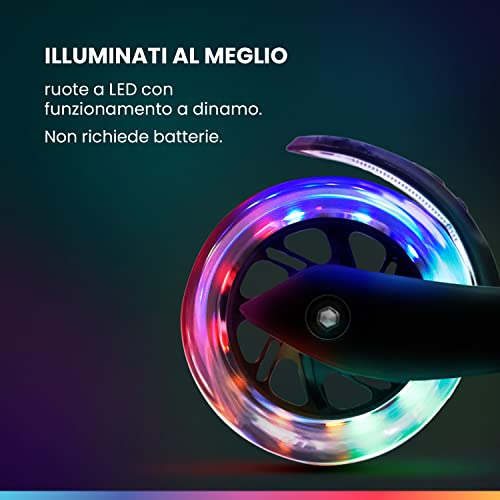 Ruote in PU di alta qualità e silenziose con cuscinetti ABEC 7 e illuminazione LED (tramite dinamo - non necessita di sostituzione della batteria).