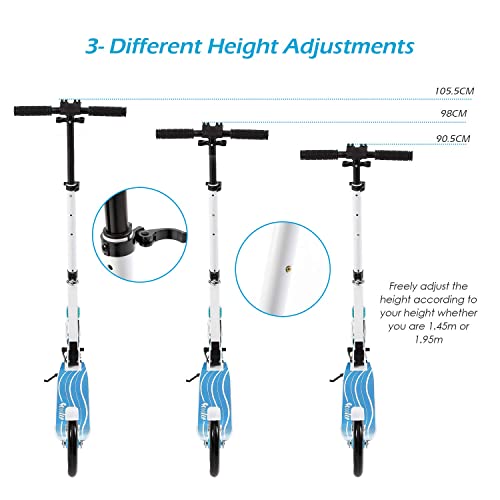 Regolabile in Altezza: l'altezza del nostro scooter da città è di 3 livelli: 90,5 cm, 98 cm, 105,5 cm, il che significa che dai 7 ai 18 anni possono utilizzare i nostri monopattino. Il designer utilizza i colori semplici per creare il concetto di cielo e nuvole bianche, godersi la libertà del ciclismo. L'altezza della pedana è di 5 cm, quindi c'è più sicurezza quando si va in salita. Fino a 100 kg, è più stabile dello scooter in commercio.