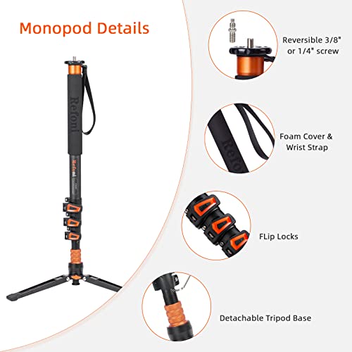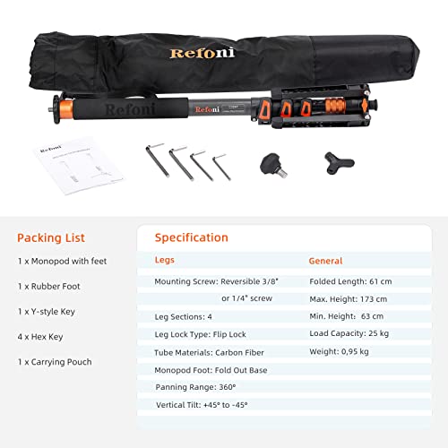 Monopiede in Carbonio, Refoni C304F Monopiede da 173 cm con piedini di supporto per reflex digitali, fotocamere compatte e mirrorless, con un carico massimo di 25 kg