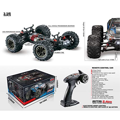 Caratteristiche: 4 WD 4 WD, veicolo completamente con cuscinetti a sfera, motore ad alte prestazioni e controllo velocità, velocità regolabile tramite telecomando, portata radio fino a 60 m, durata della batteria fino a 15 minuti, trasmissione cardanica in alluminio